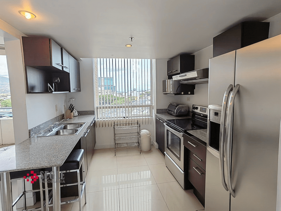 Sala y comedor amplios con aire acondicionado, cocina moderna con desayunador.