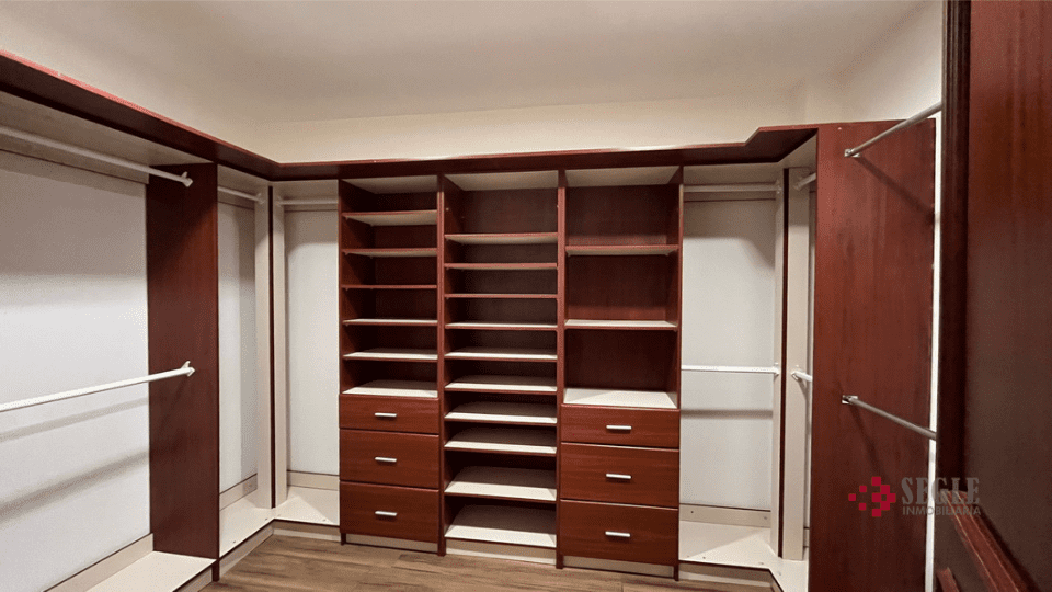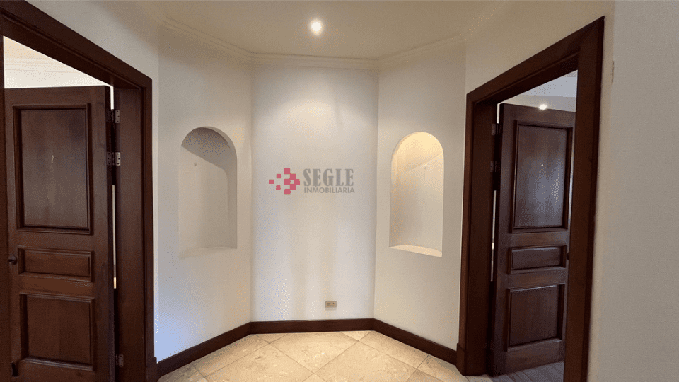 Vestíbulo elegante con mezanine, medio baño de visitas, dormitorio principal con doble walk in closet y doble lavatorio, con espacio para oficina.